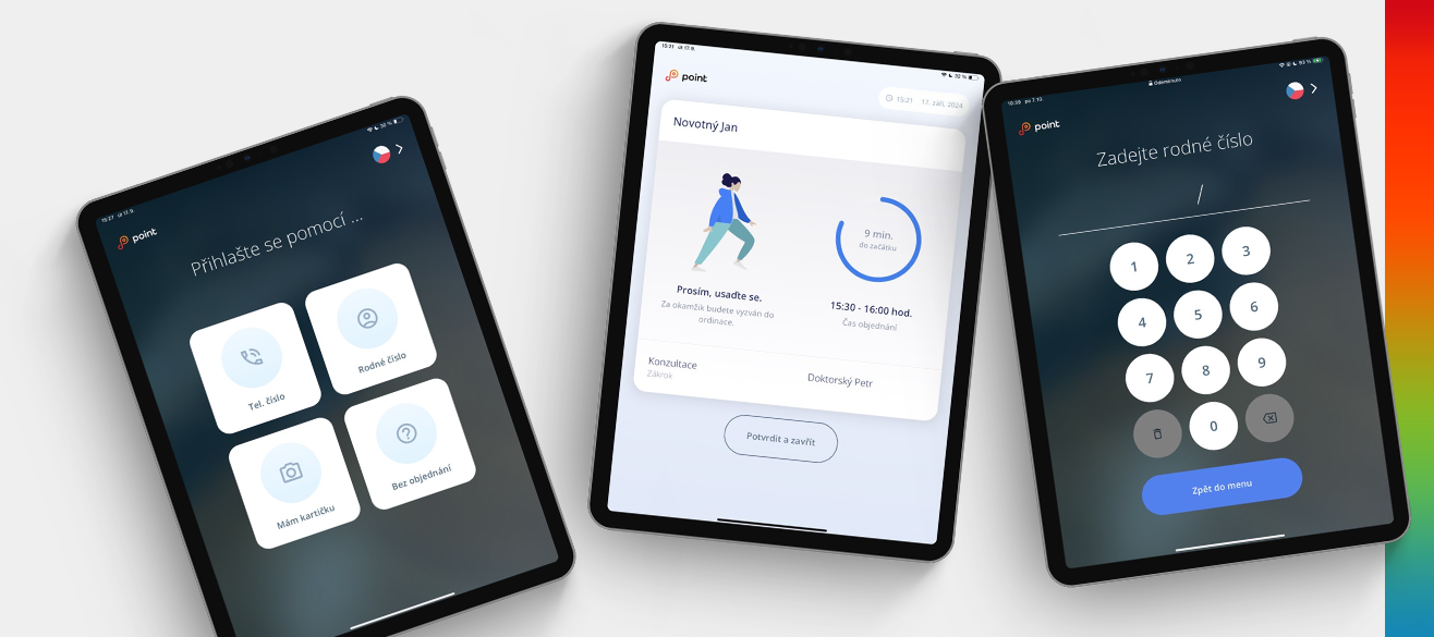 Po příchodu do čekárny se pacient sám identifikuje, čímž informuje ordinaci o své přítomnosti. Aplikace automaticky označí pacienta jako čekajícího v kalendáři lékaře, který získá informaci, že se pacient dostavil. POINT zefektivňuje proces odbavení, snižuje administrativní zátěž a zajišťuje plynulou komunikaci mezi pacienty a zdravotnickým personálem. Intuitivní rozhraní umožňuje snadné použití a integraci do každodenního provozu. Zobrazené informace si spravujete přímo v aplikaci POINT.