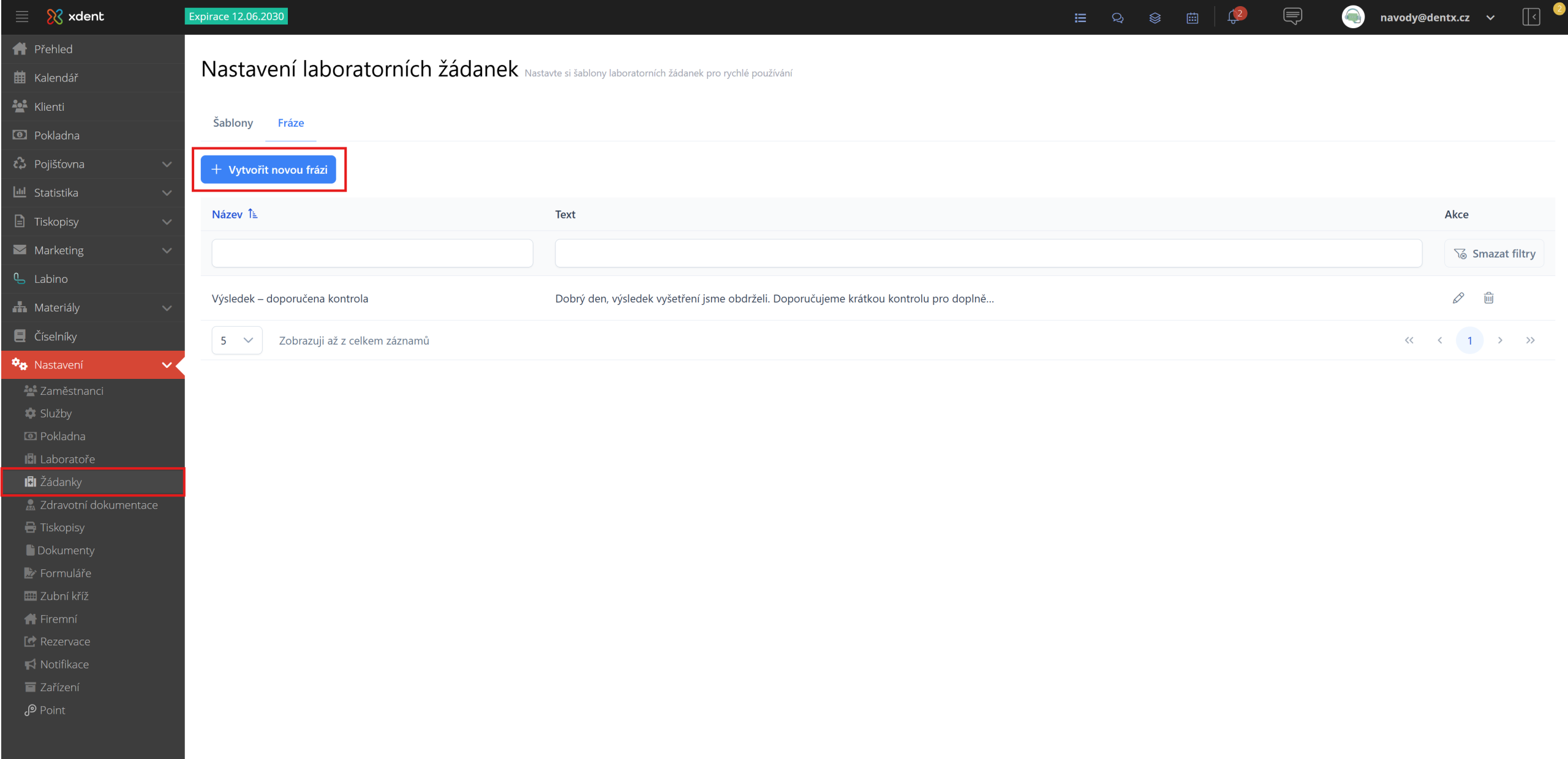 Frázi vytvoříte v sekci Nastavení -> Žádanky a následně kliknutím na funkci „Vytvořit novou frázi“.