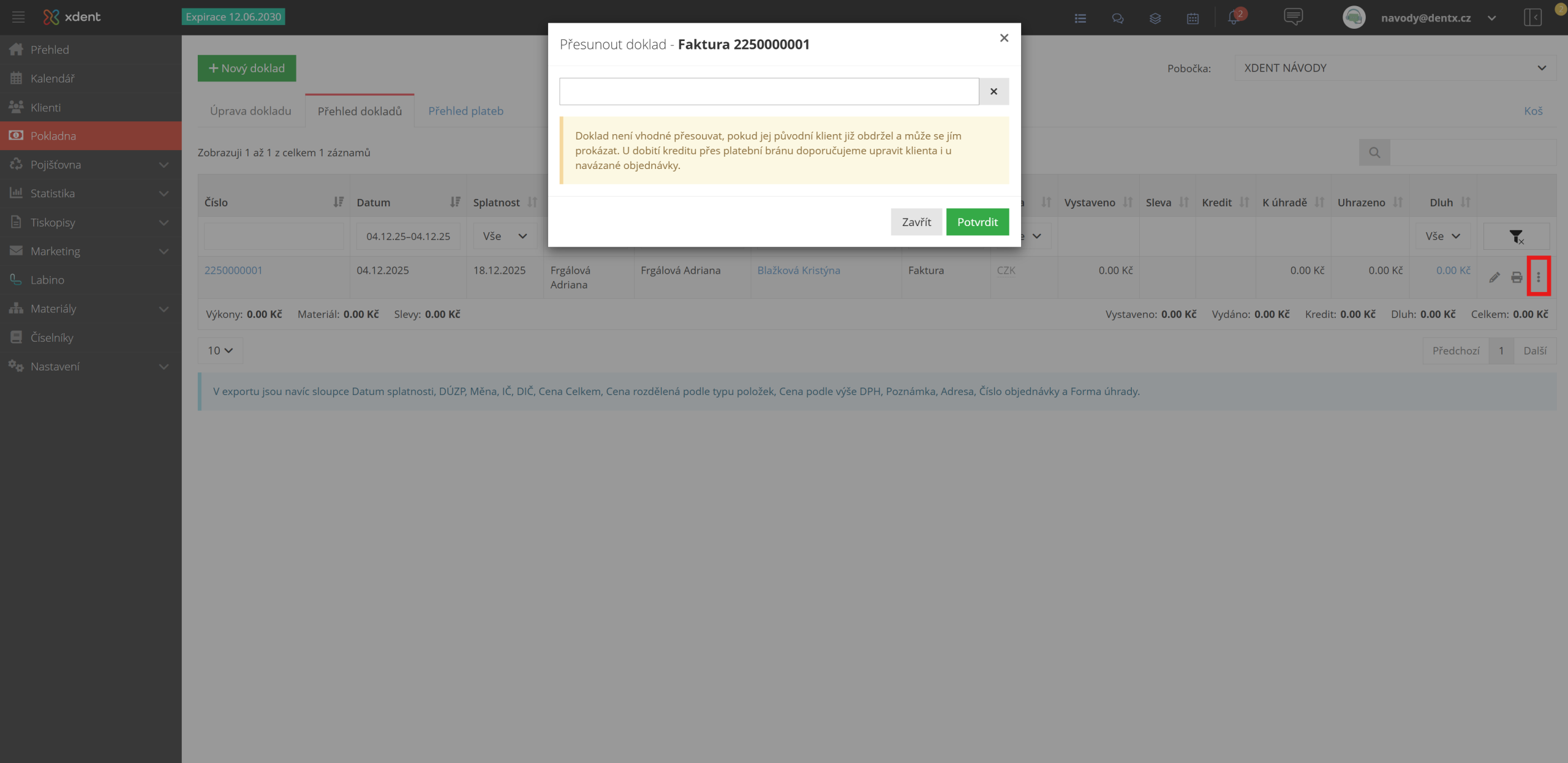 1) Přesun dokladů mezi pacienty (novinka v pokladně)
