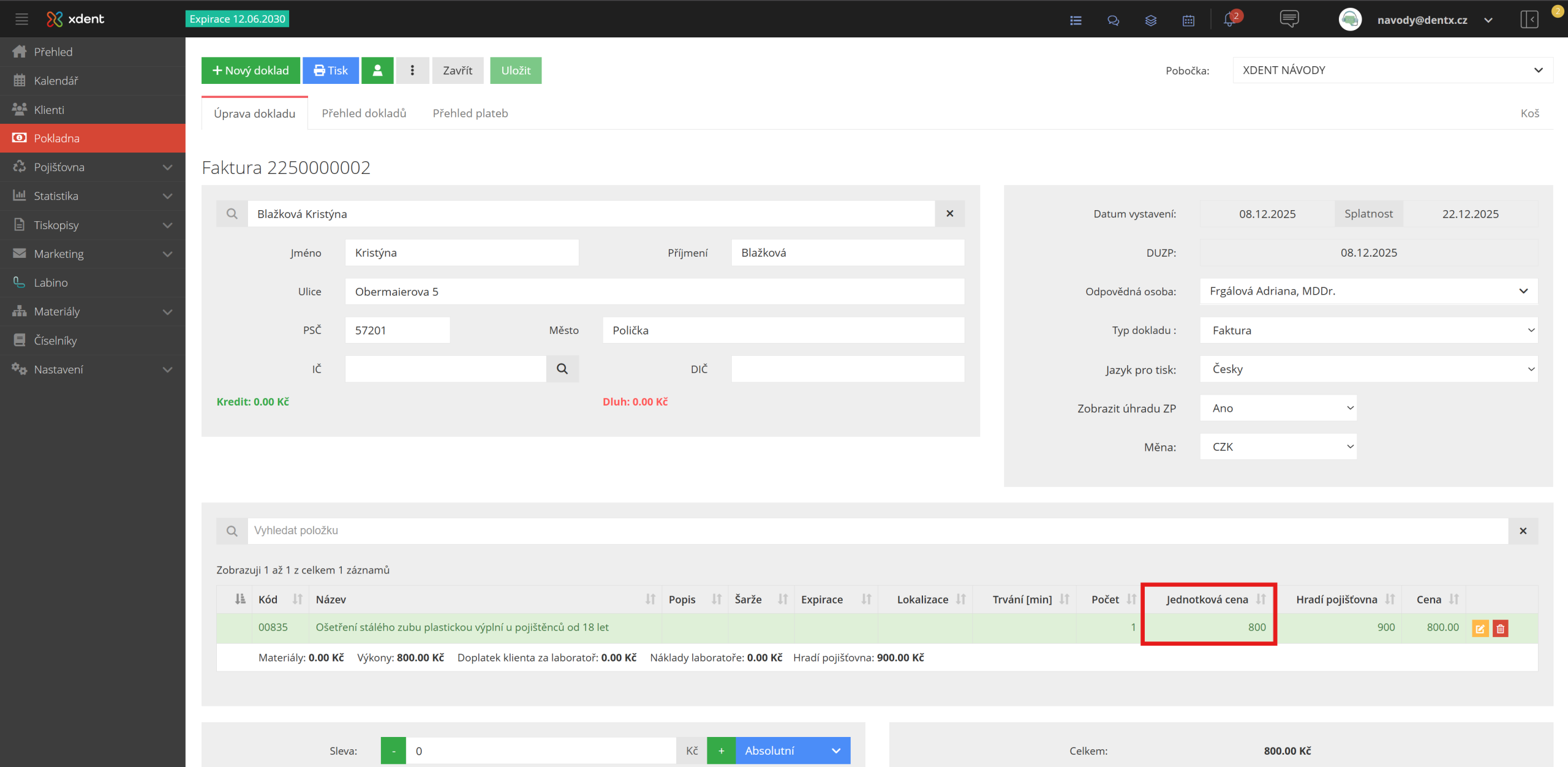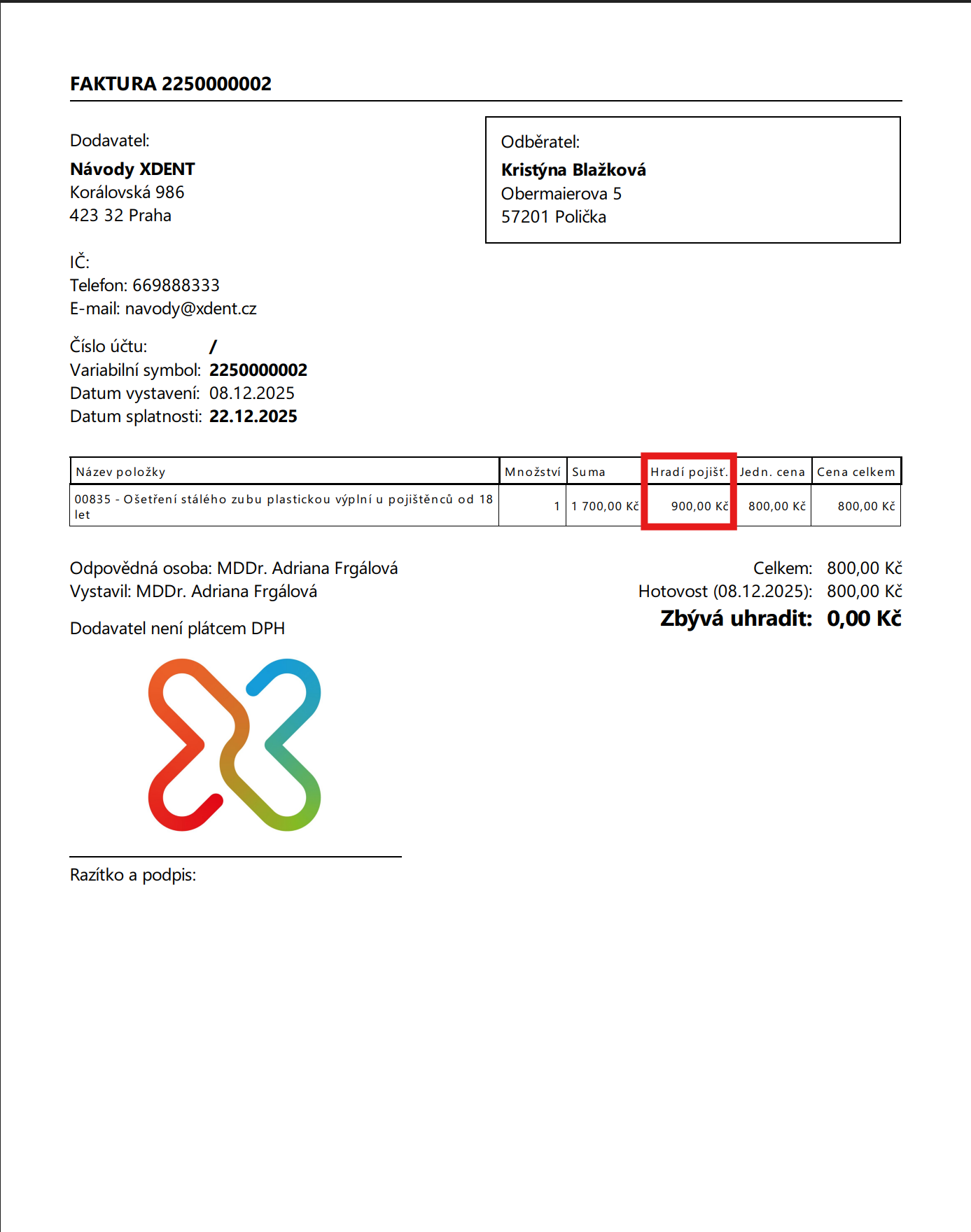 Pokud necháte stav „Ano“ dokument následně obsahuje informaci o částce, kterou hradí pojišťovna