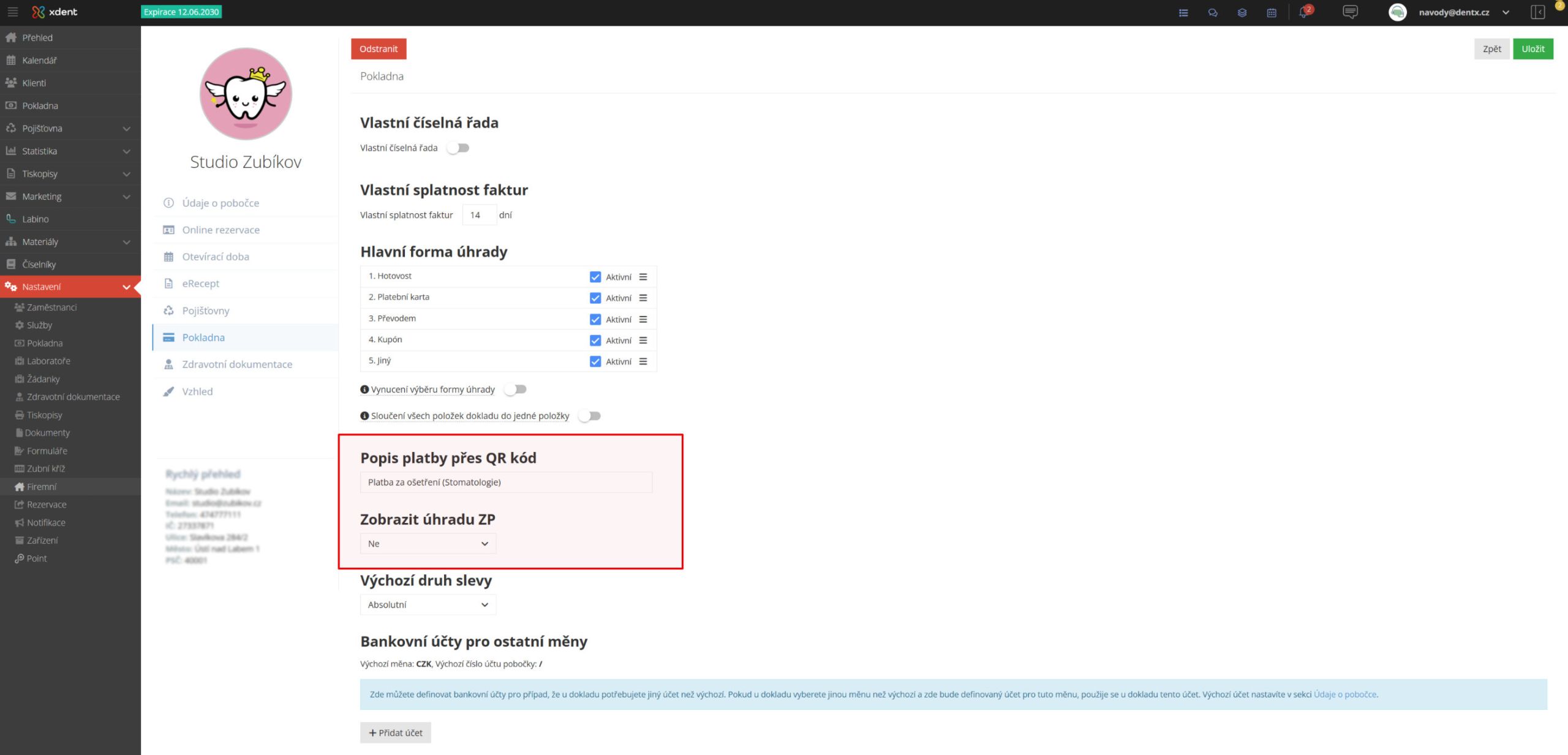 V nastavení pobočky přibylo několik novinek, které zjednodušují každodenní práci a dávají větší kontrolu přímo do rukou jednotlivých pracovišť. Nově si mohou pobočky upravit popis platby u QR kódu podle svých potřeb (s limitem 50 znaků kvůli přehlednosti QR kódu), přednastavit zobrazení úhrady zdravotní pojišťovny v pokladně a také spravovat používané tiskopisy přímo na úrovni pobočky.